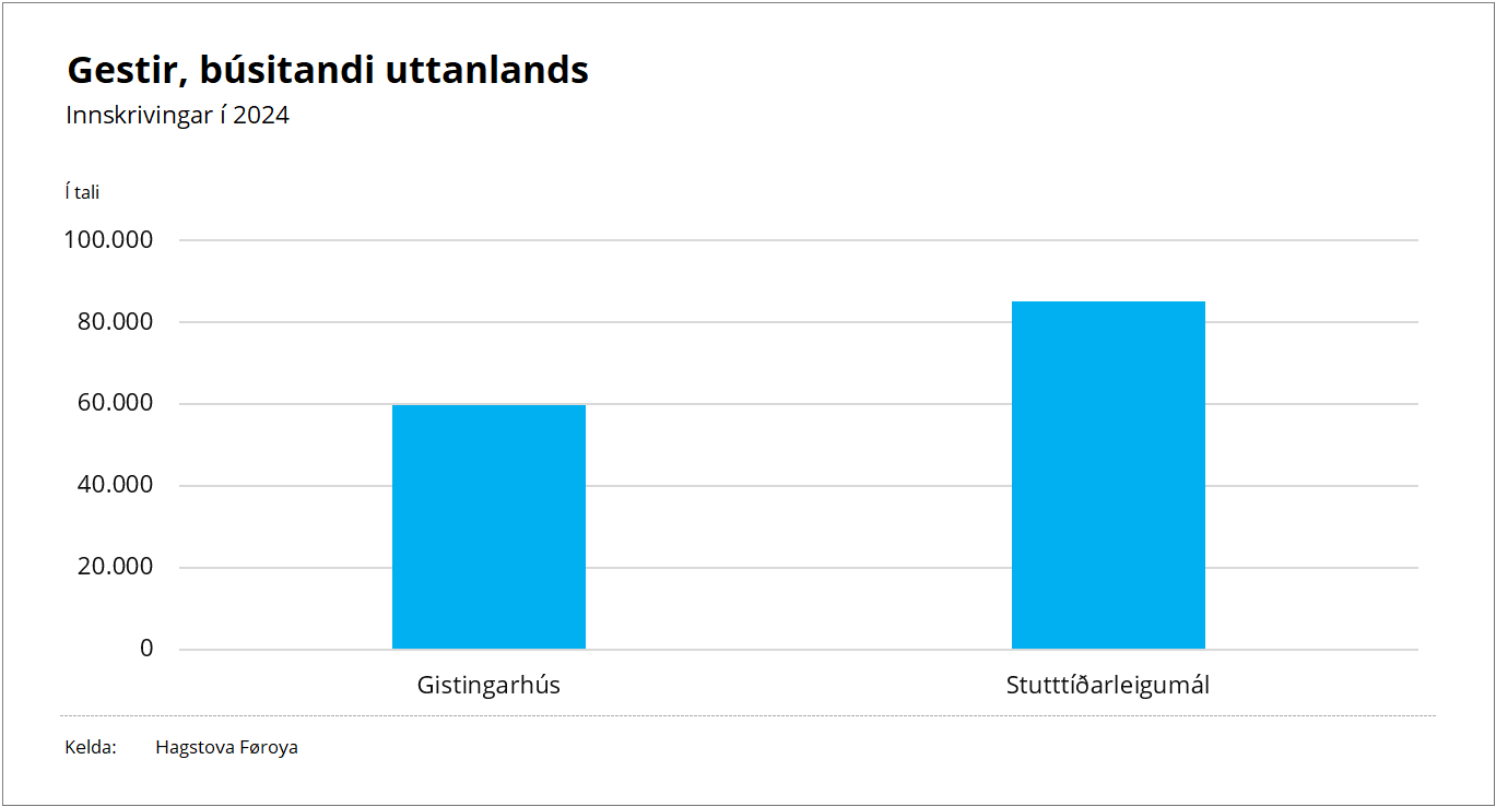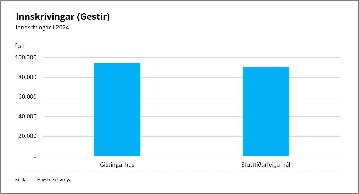 Nærum eins nógvir gestir vóru í stutttíðarleigumálum sum á gistingarhúsunum í 2024. Tað vóru góðir 90.000 gestir, sum gistu í stutttíðarleigumálum. Til samanberingar gistu 95.000 gestir á gistingarhúsunum sama tíðarskeið.