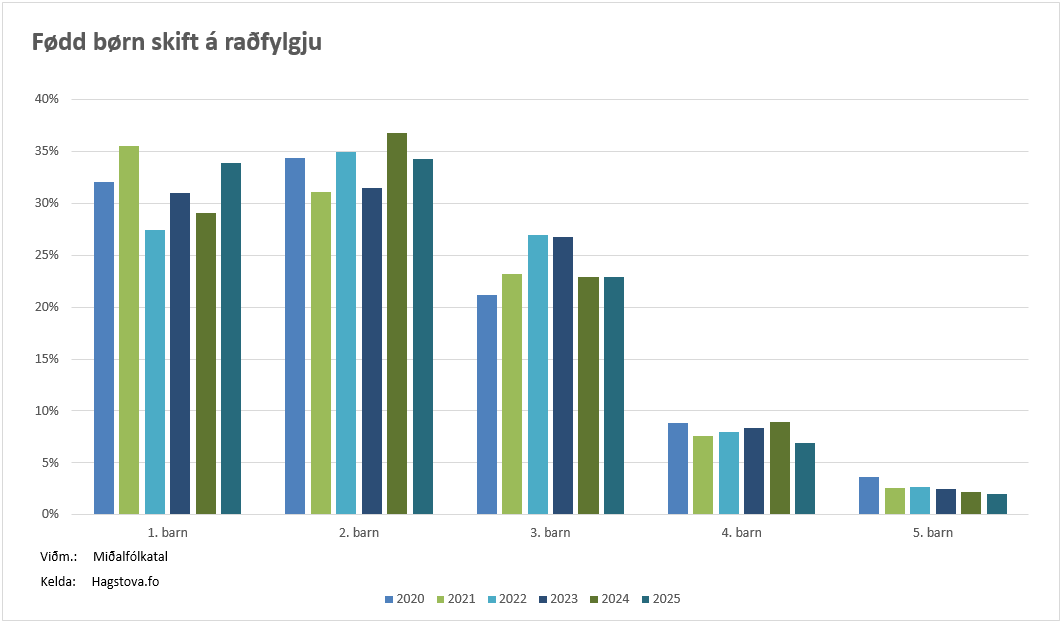 Tað vóru 642 børn fødd í 2025. Tað eru 50 fleiri børn enn í 2024. Vøksturin av føddum børnum var serliga millum kvinnur, sum áttu fyrsta barnið. Ein góður triðingur av børnunum í 2025 vóru fyrsta barn, og somuleiðis ein triðingur var annað barn. Í 2024 vóru 29 prosent av børnunum fyrsta barn, meðan 37 prosent vóru annað barn.