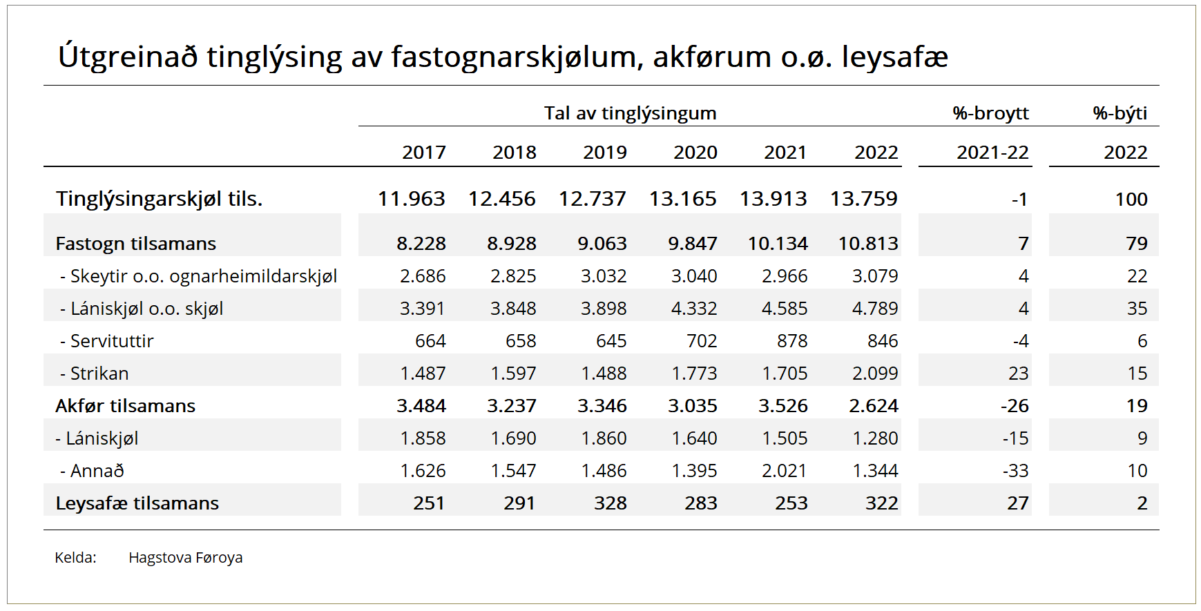 Documents regarding real estate, such as title deeds and loan papers, made up 79% of all registered documents in 2022. Loan papers and other documents relating to vehicles made up 19%, while the remaining 2% related to other personal property.