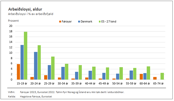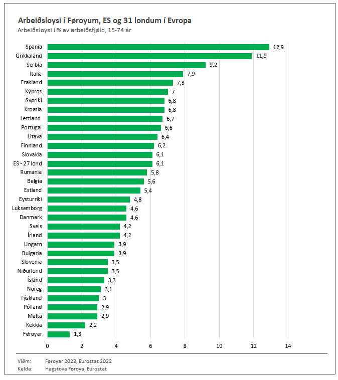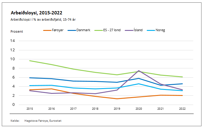 Unemployment in the Faroes is now at the same level as in 2019, prior to the onset of the Covid pandemic. The unemployment rate has been declining since 2021.