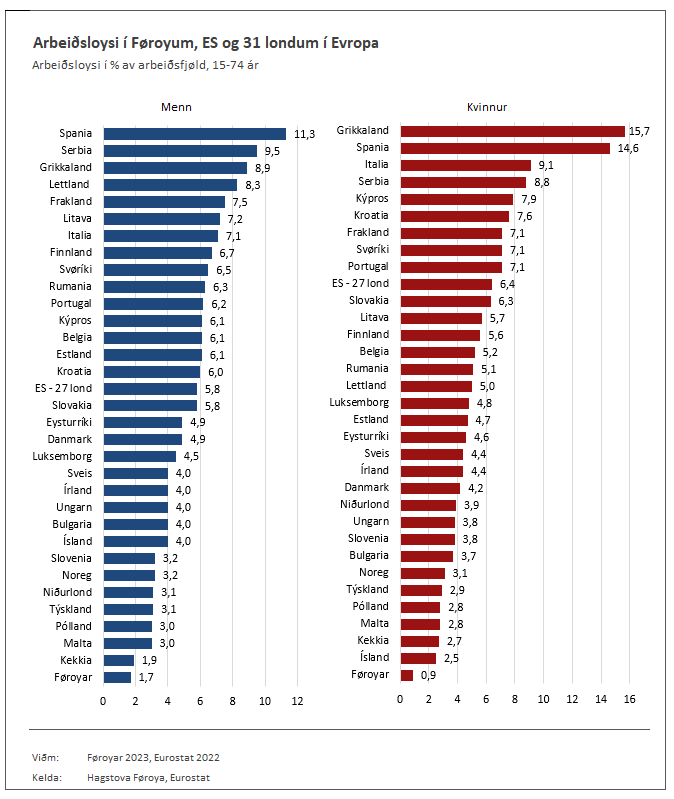 Faroese unemployment is the lowest in Europe for both sexes. Faroese women have an exceptionally low rate, at 0.9% – a substantial 1.6% gap to the second-lowest rate for women (Iceland at 2.5%). The rate for Faroese men is 0.2% lower than in the Czech Republic.