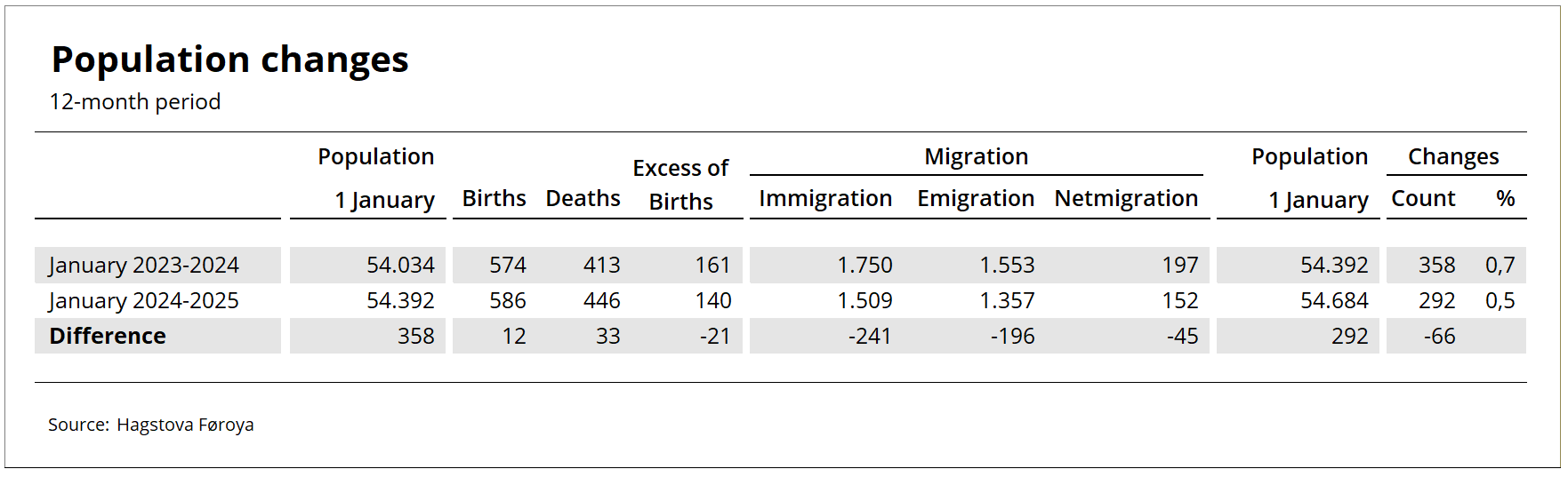 The five municipalities with the highest population growth in 2024 were Tórshavn, Nes, Runavík, Sjóvar and Skálavík. Compared to 2023, Sjóvar and Skálavík have replaced Klaksvík and Eystur on the top-5 list of municipalities with the highest population growth in 2024.